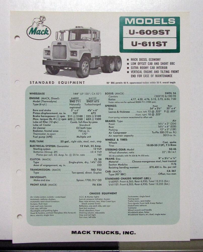 1967 Mack Truck Model U 609st 611st Specification Sheet